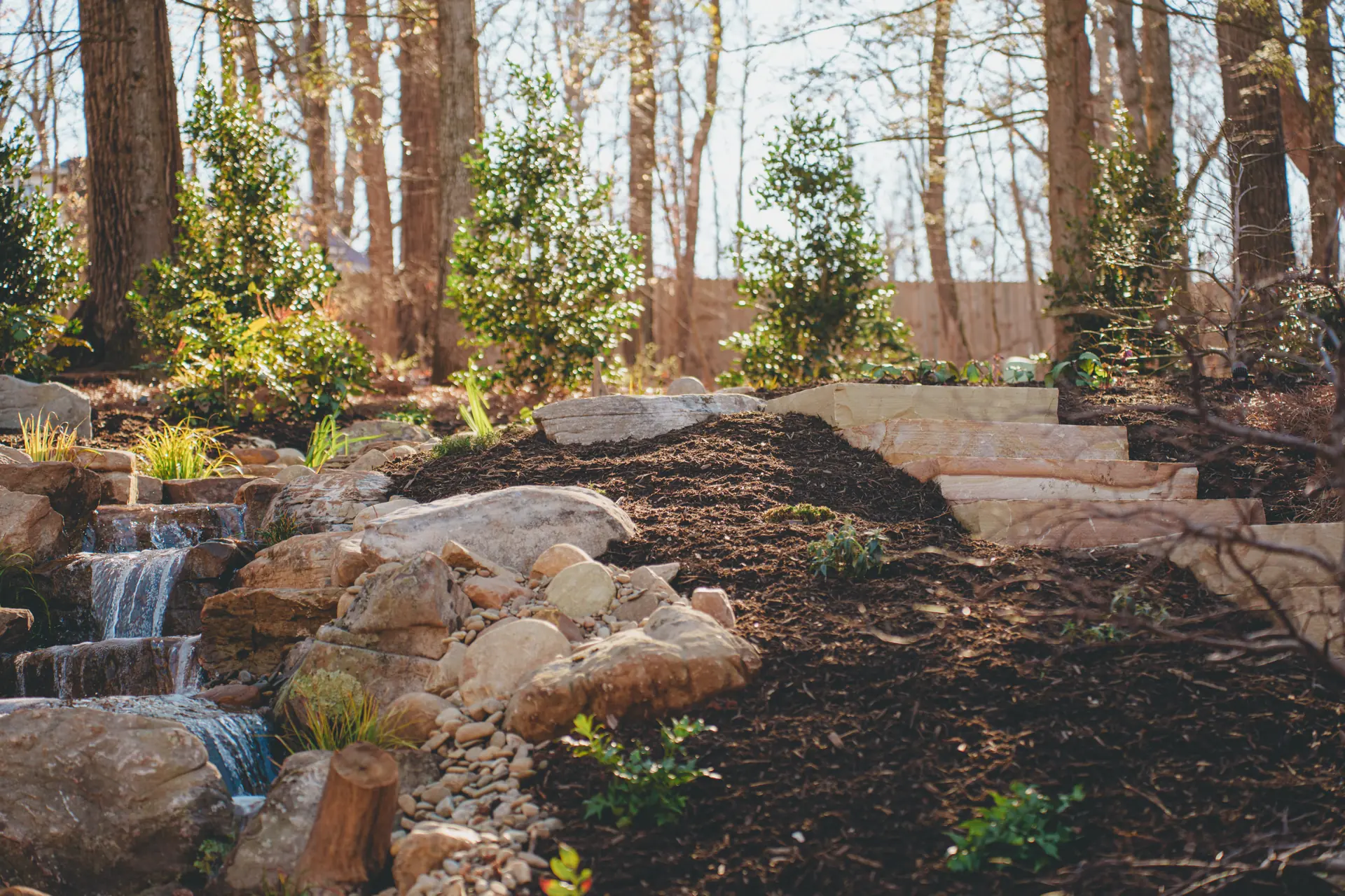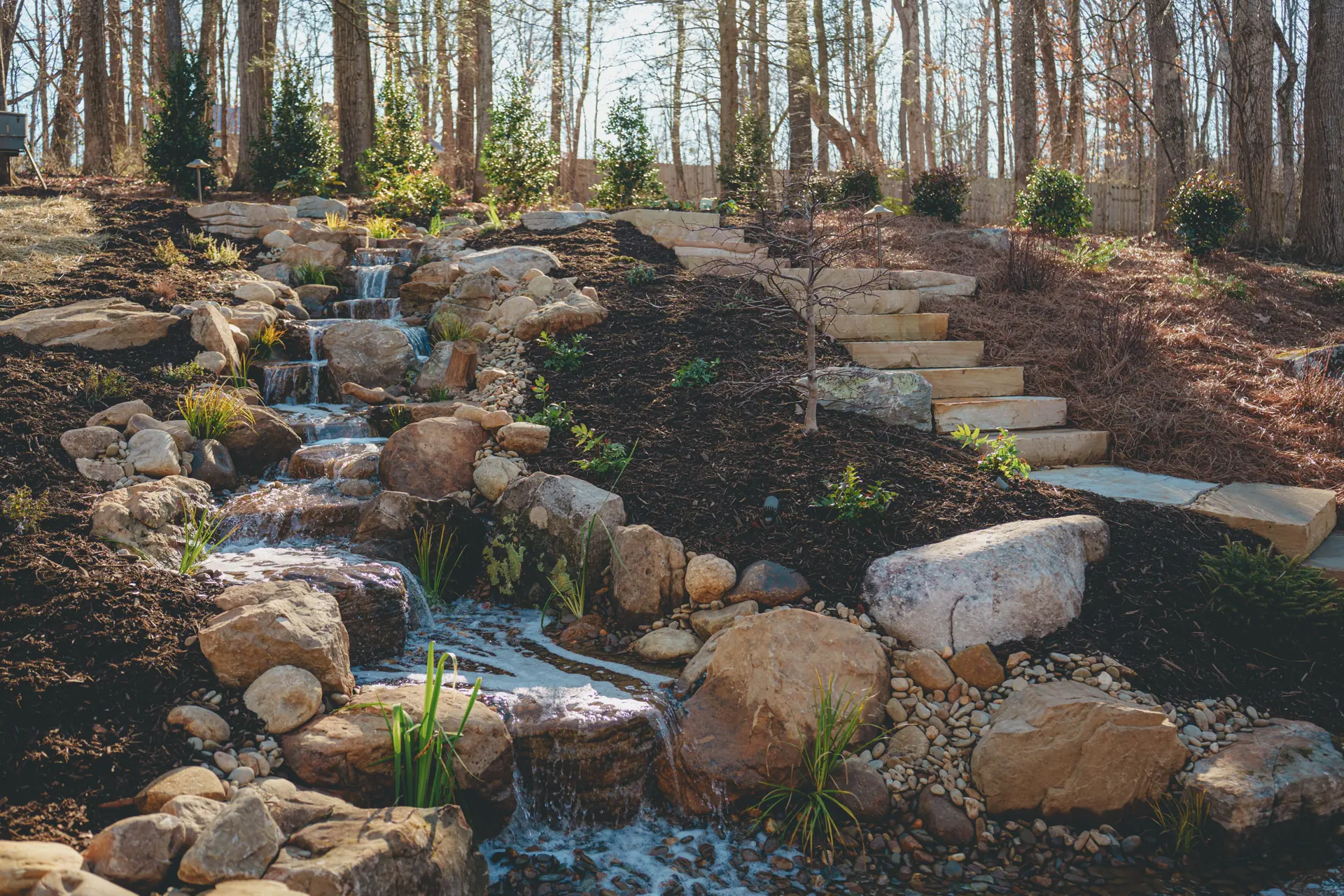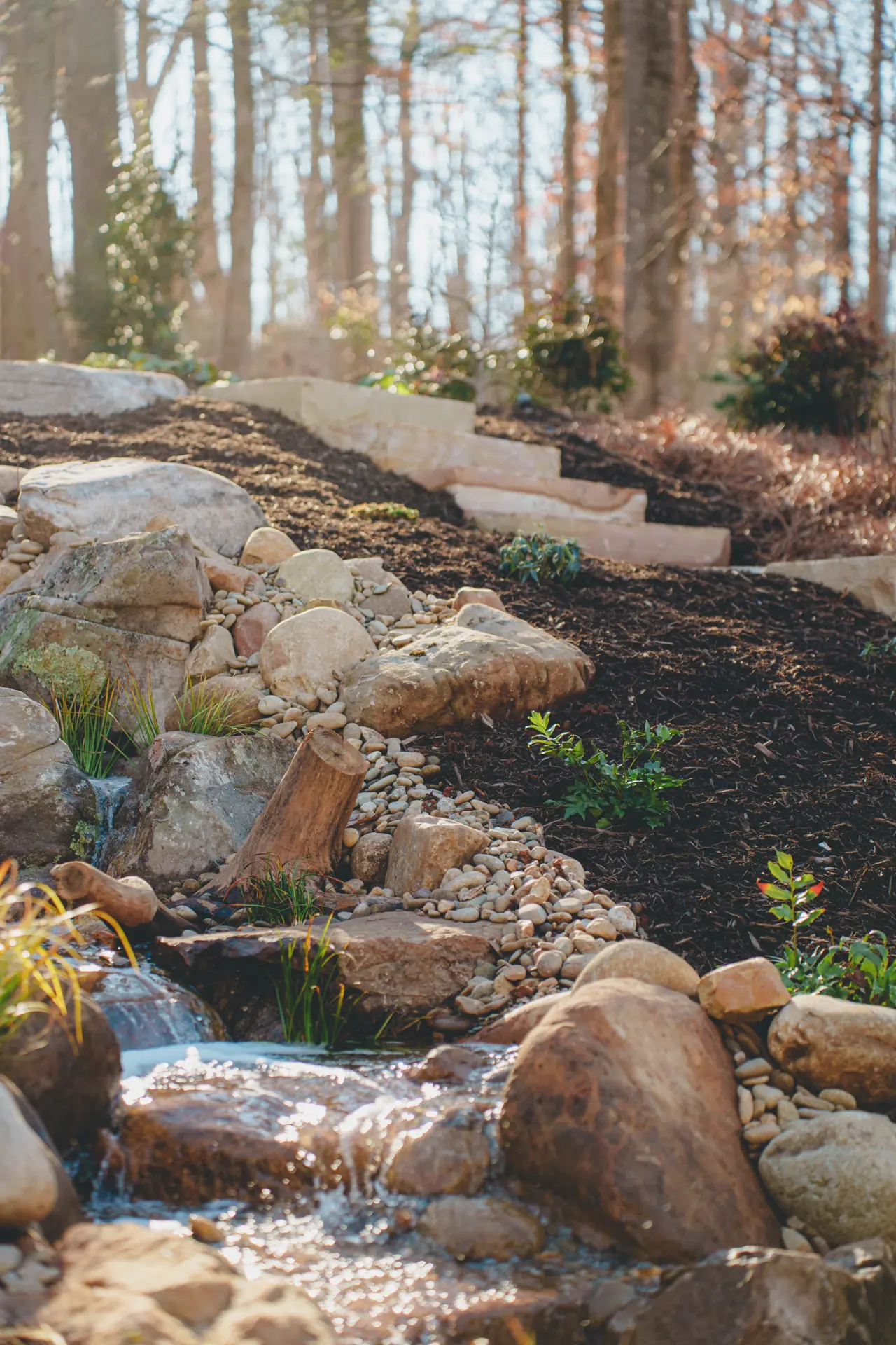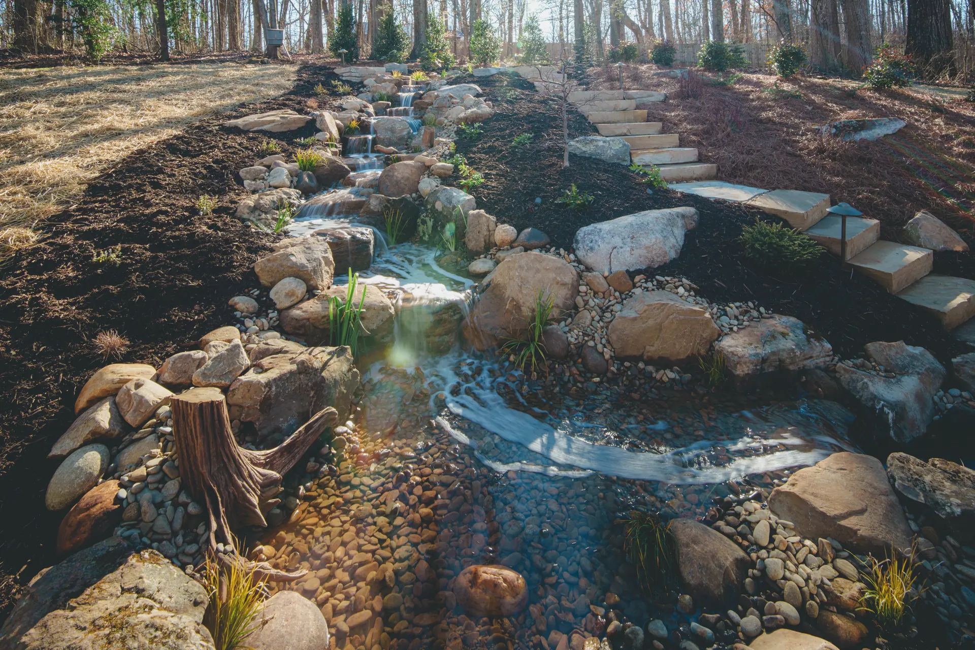 The finished landscape is both calming and engaging. The sound of moving water pulls you into the space, while the layered design encourages you to explore up the hillside.