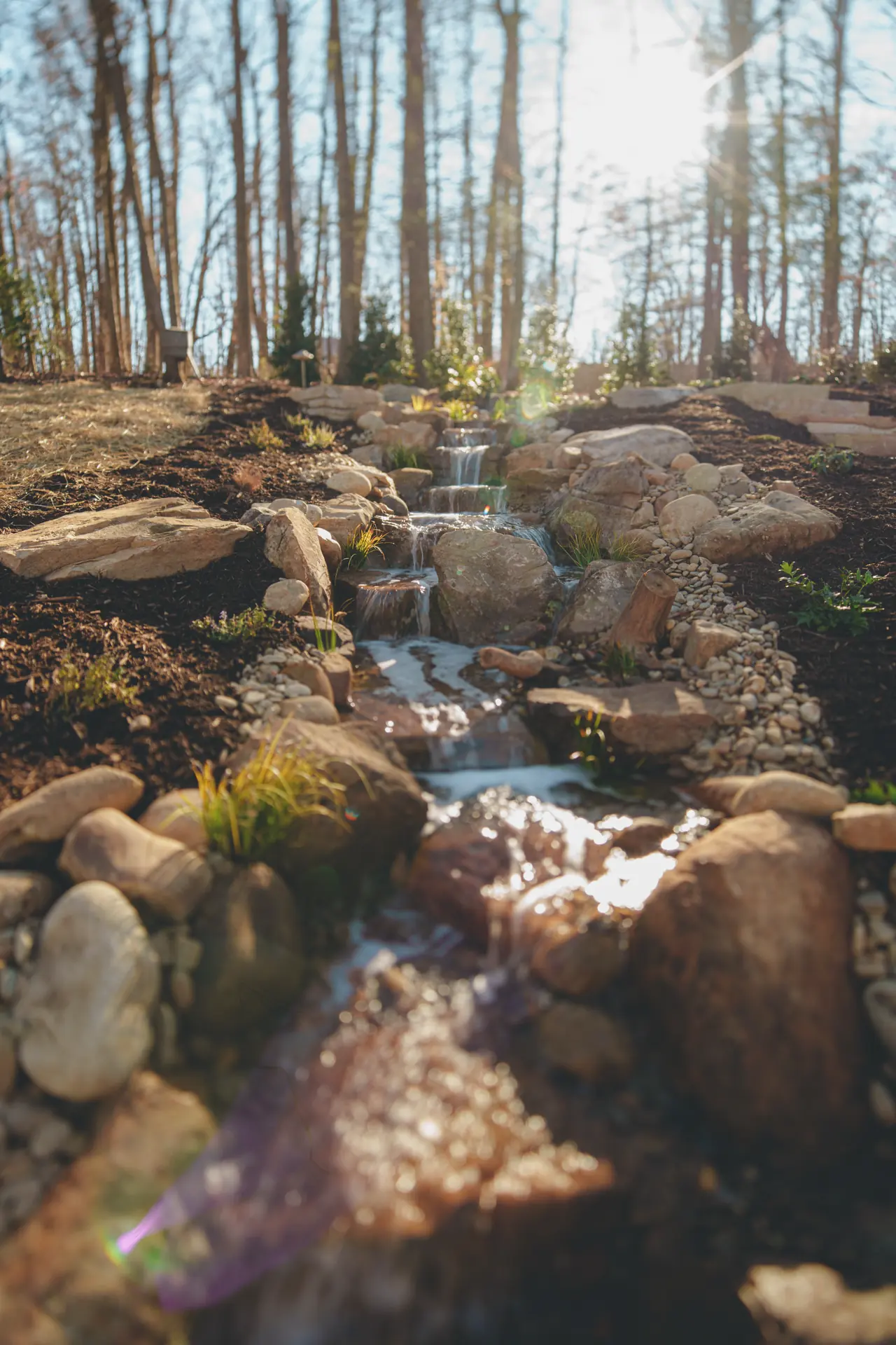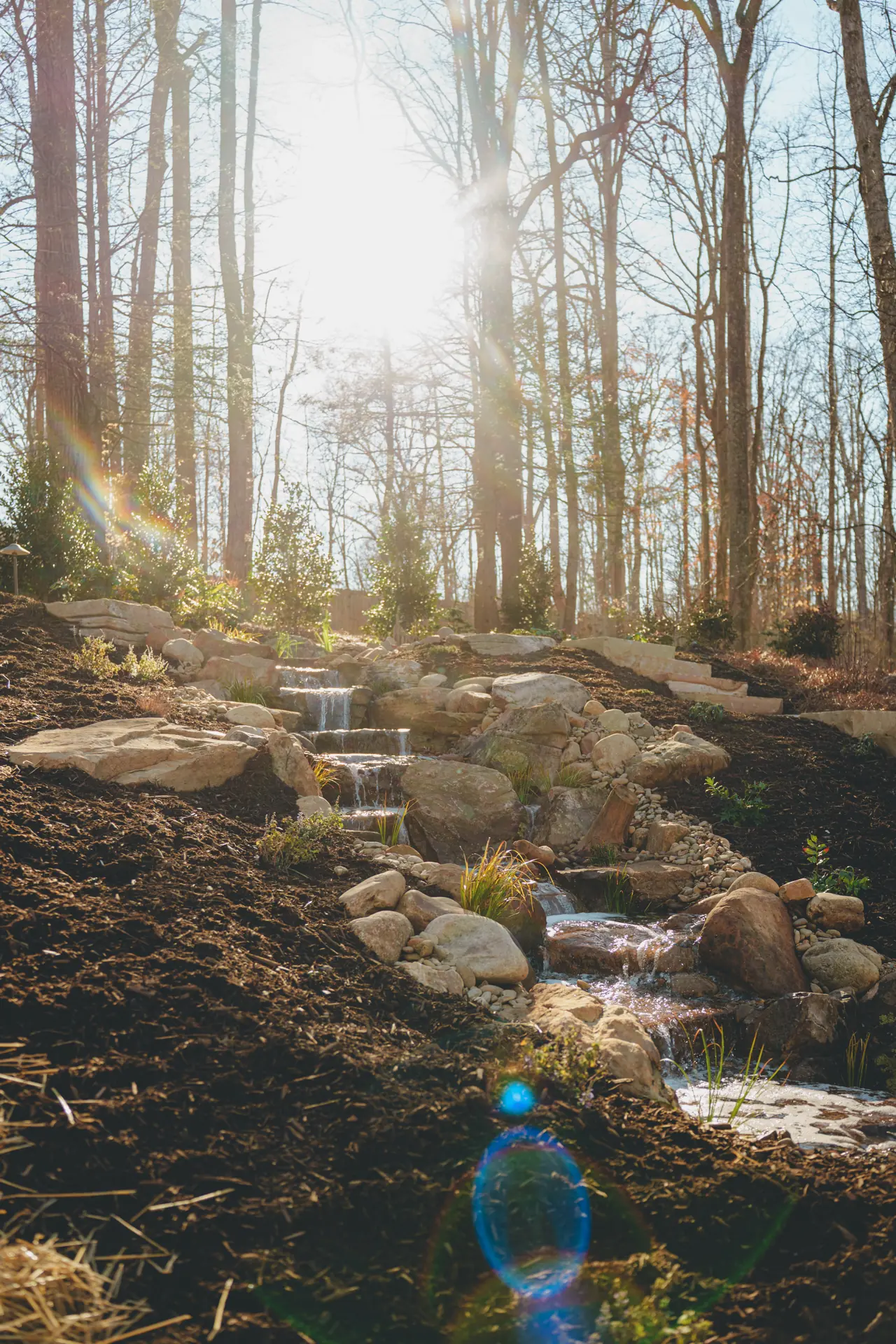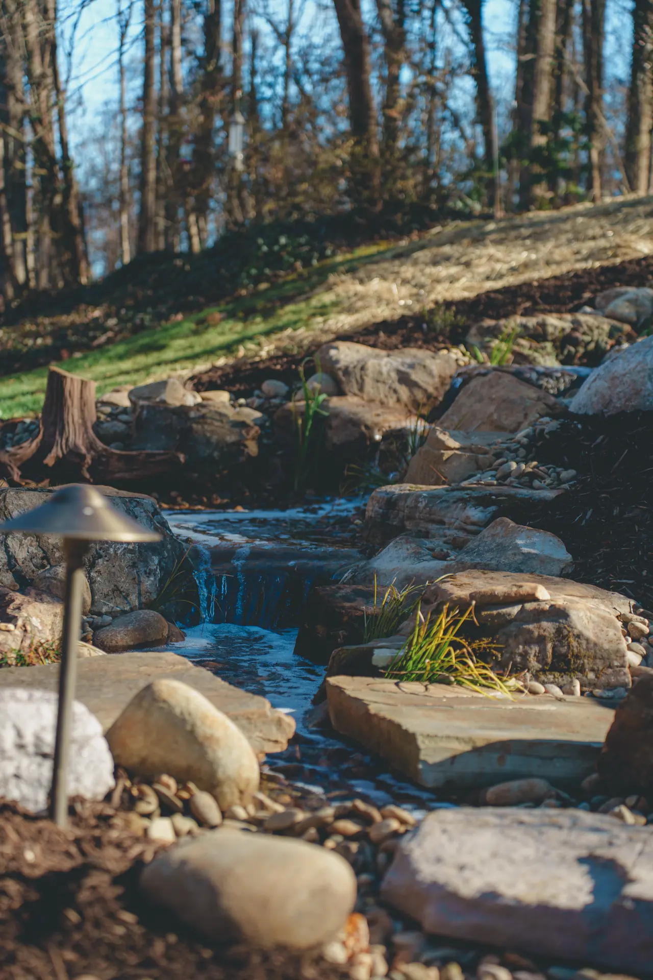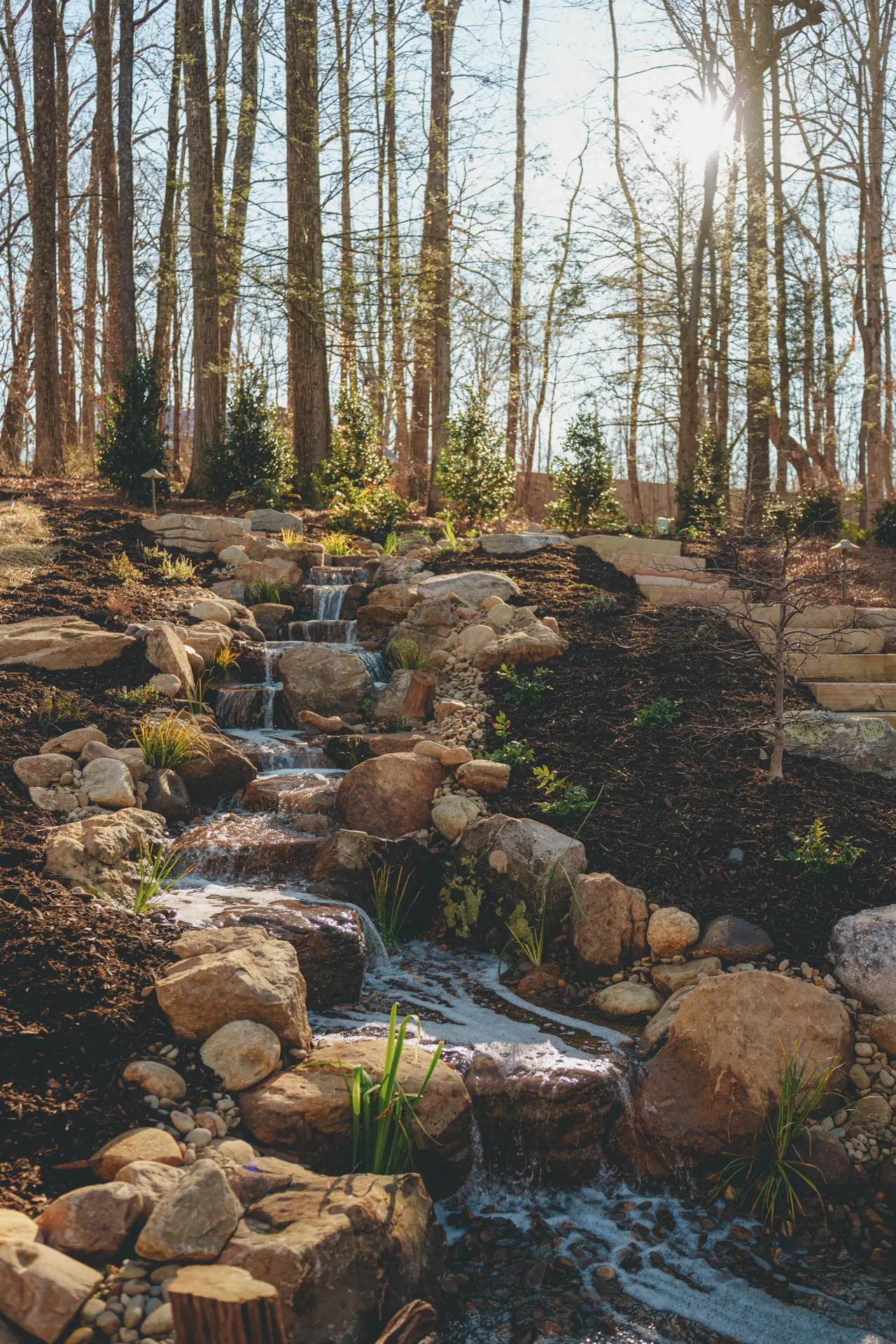 Two natural stone stream crossings were also incorporated, making it easy to move through the space without interrupting the flow of the waterfall.