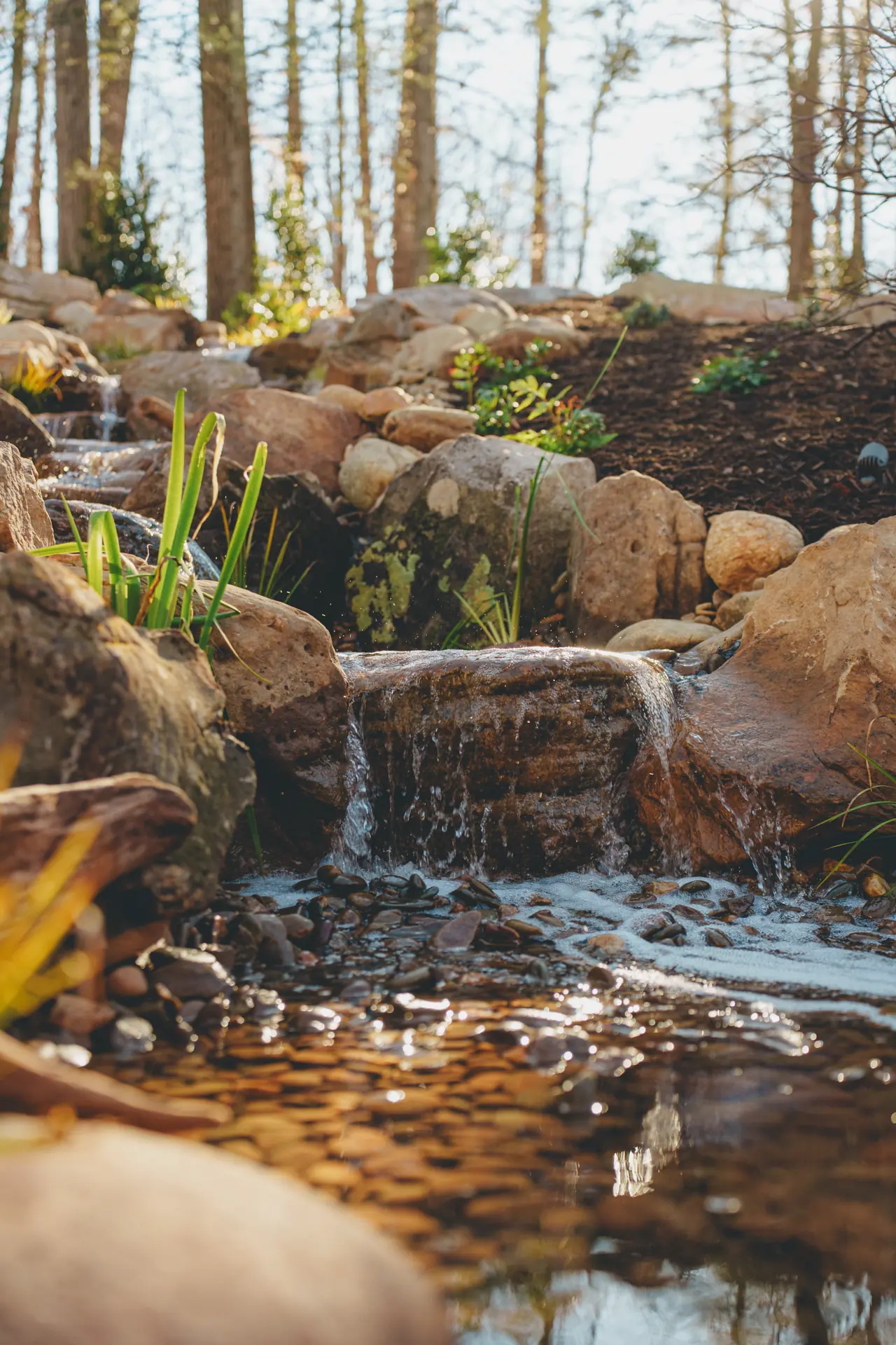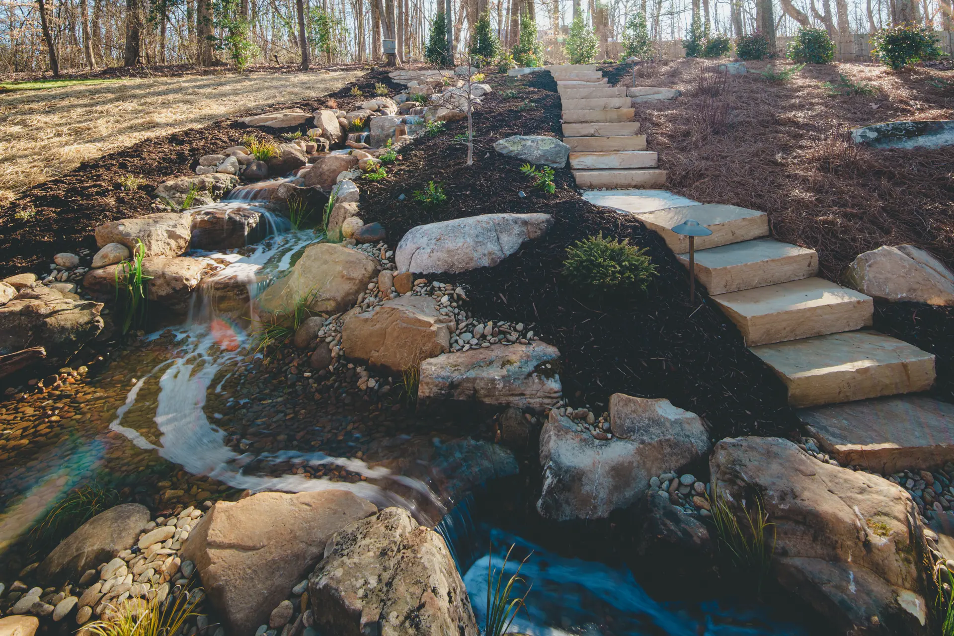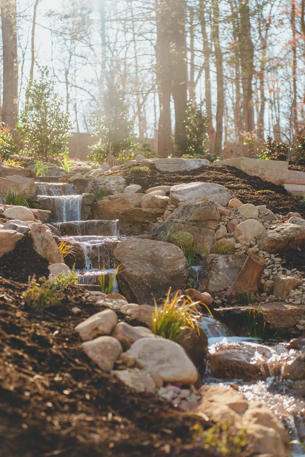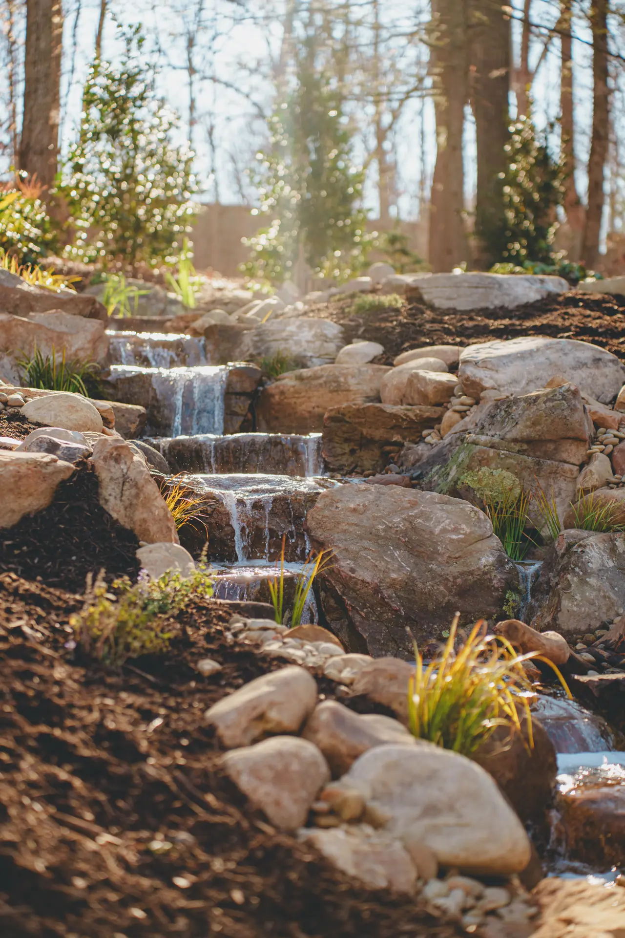 Two natural stone stream crossings were also incorporated, making it easy to move through the space without interrupting the flow of the waterfall.