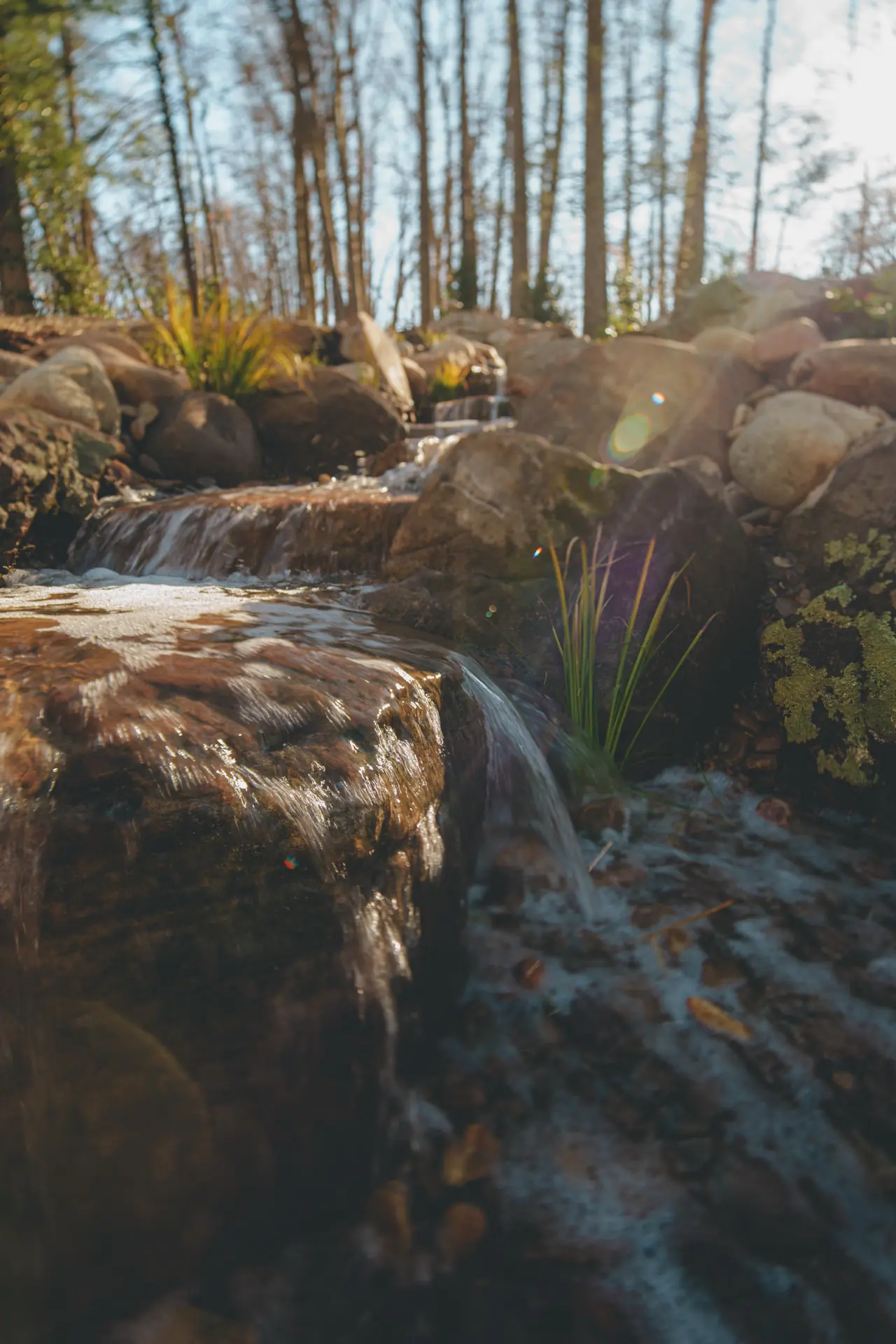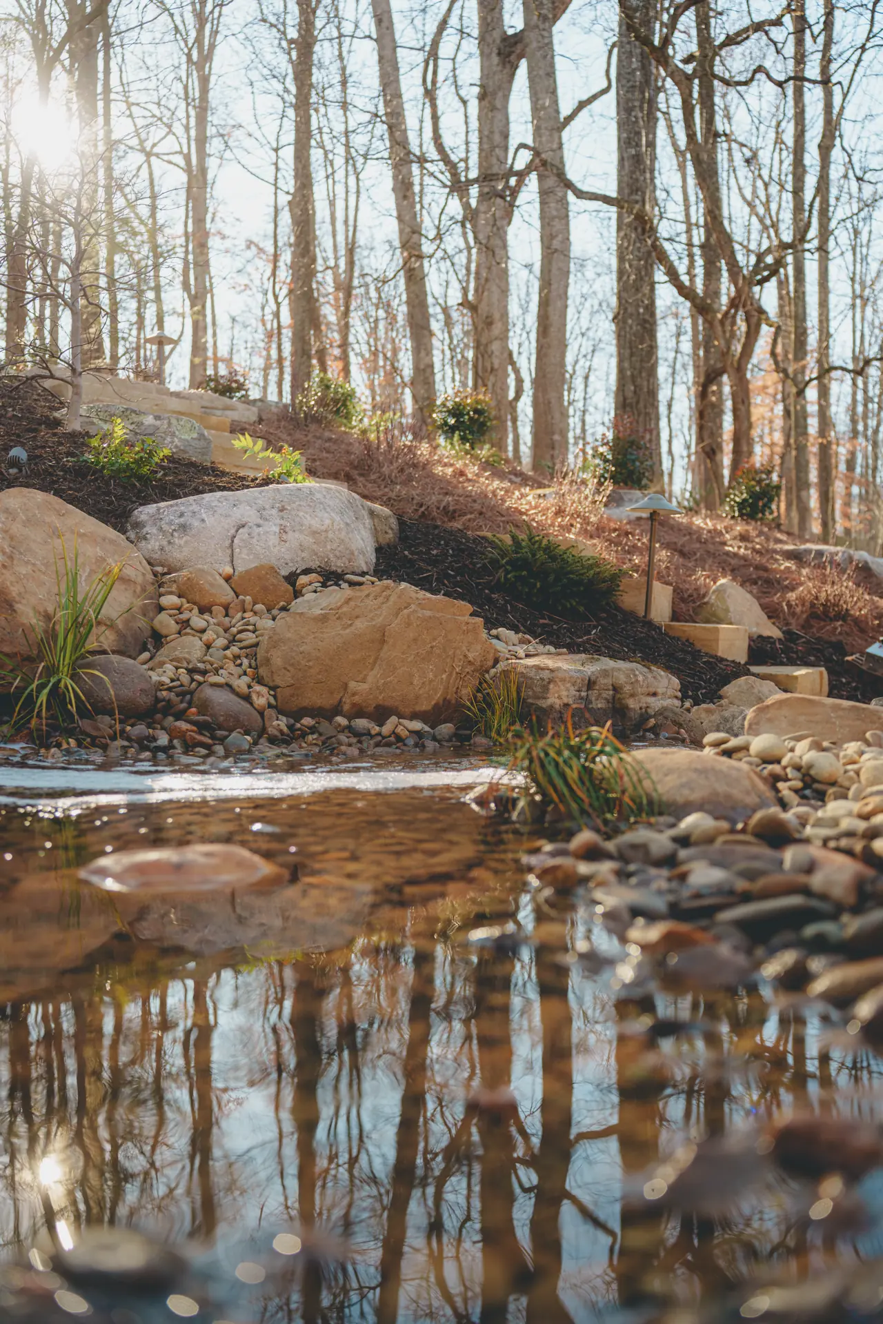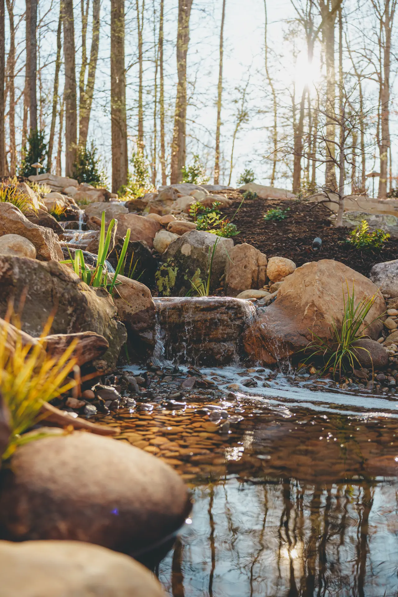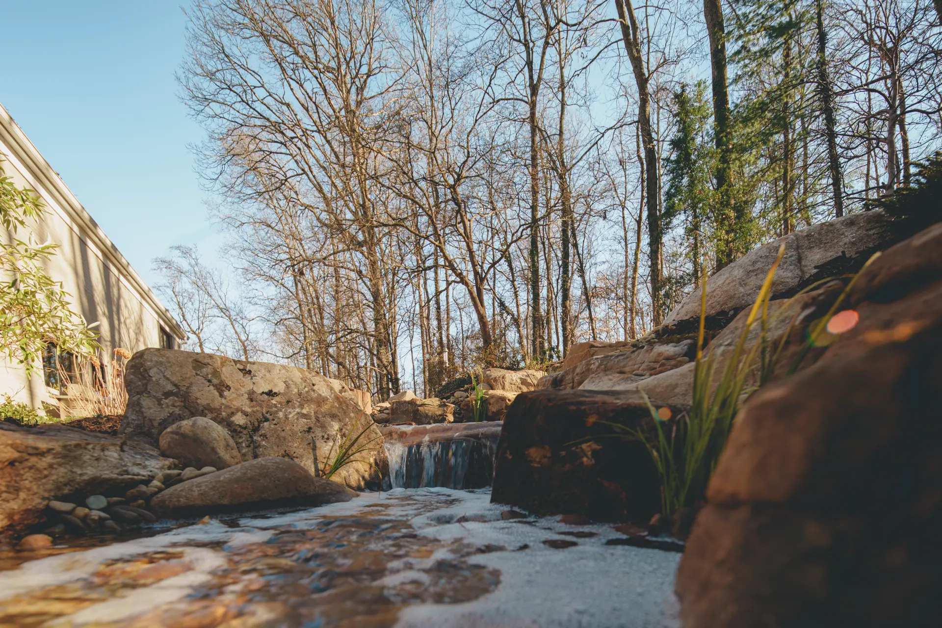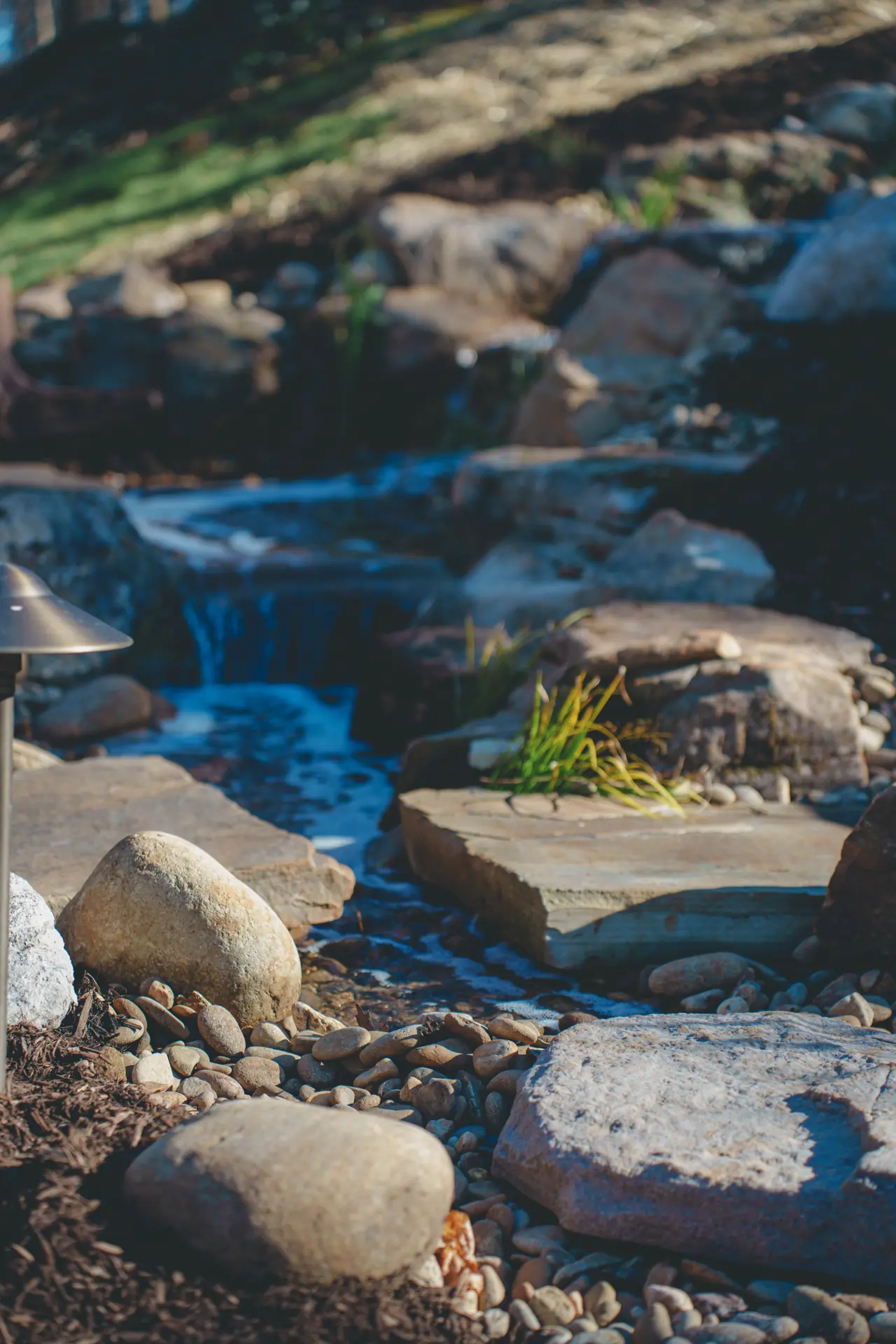 Two natural stone stream crossings were also incorporated, making it easy to move through the space without interrupting the flow of the waterfall.
