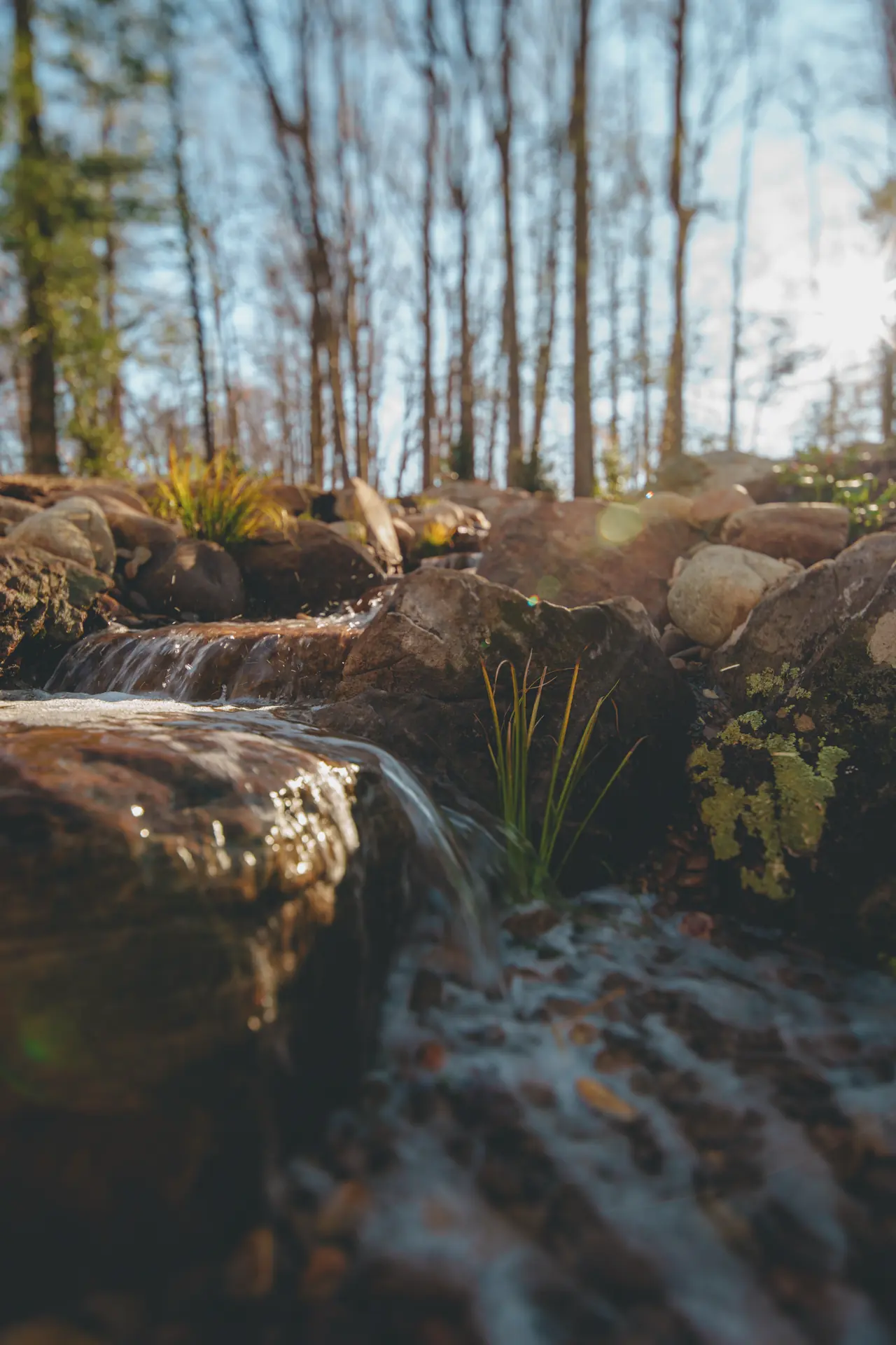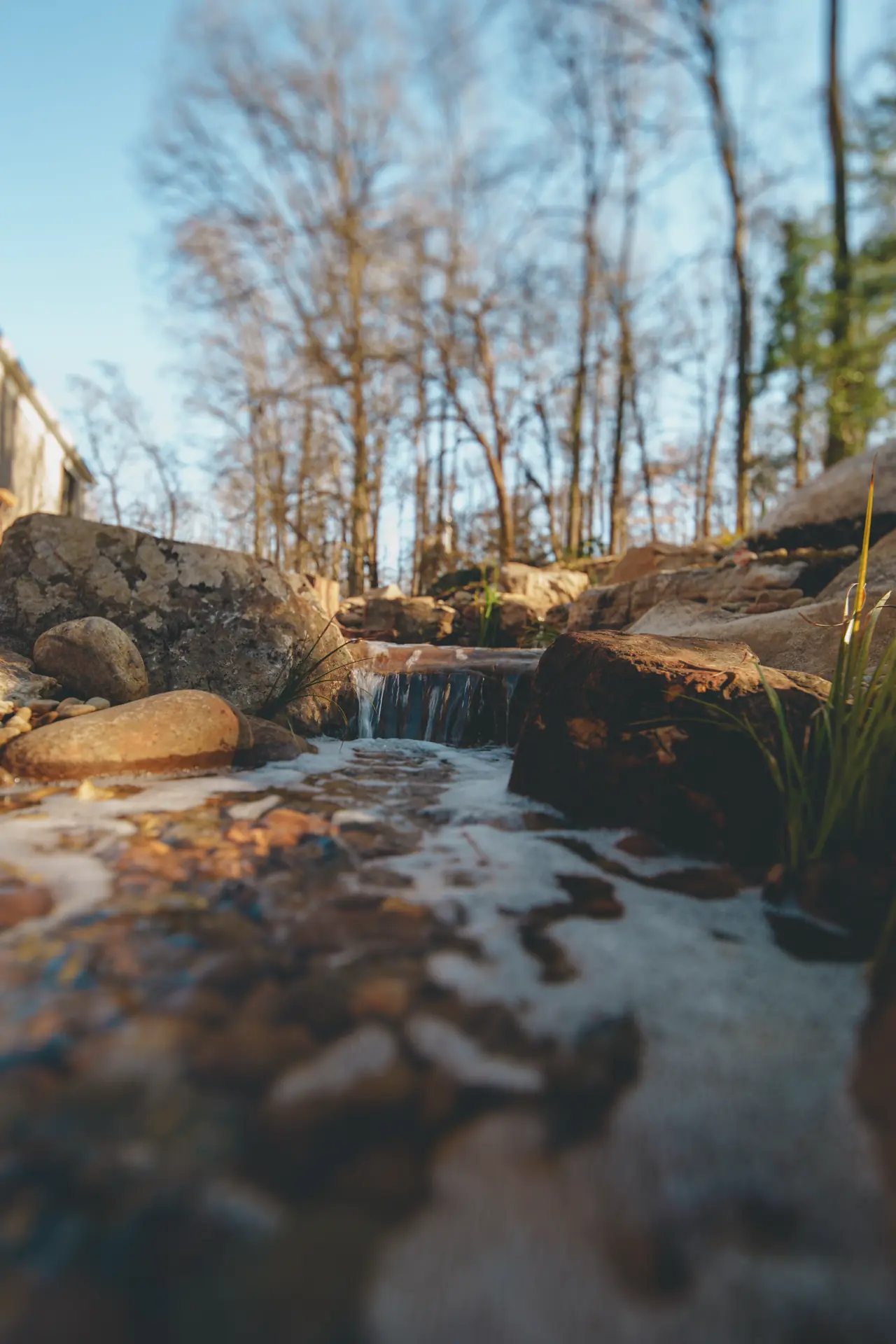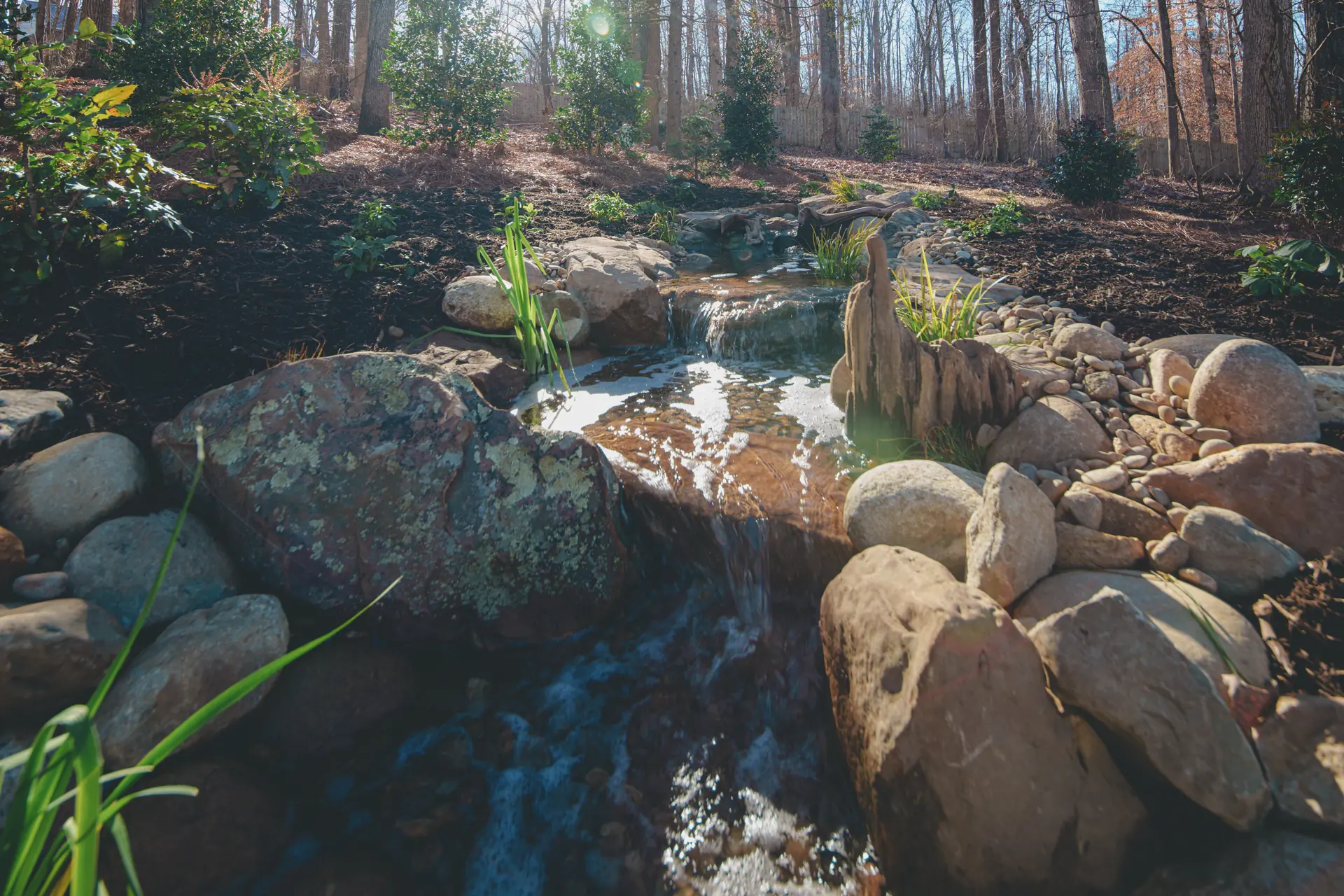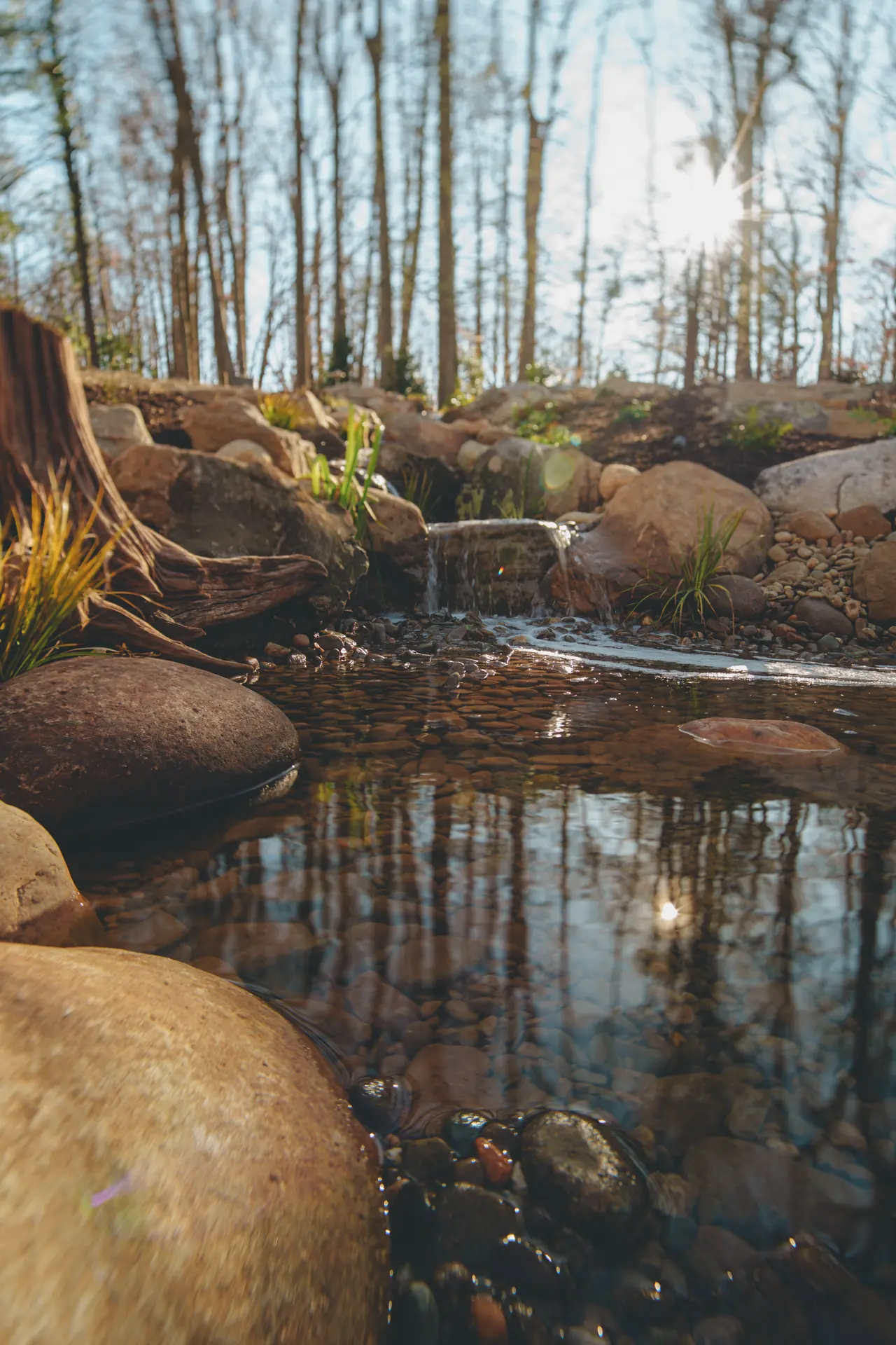 Two natural stone stream crossings were also incorporated, making it easy to move through the space without interrupting the flow of the waterfall.
