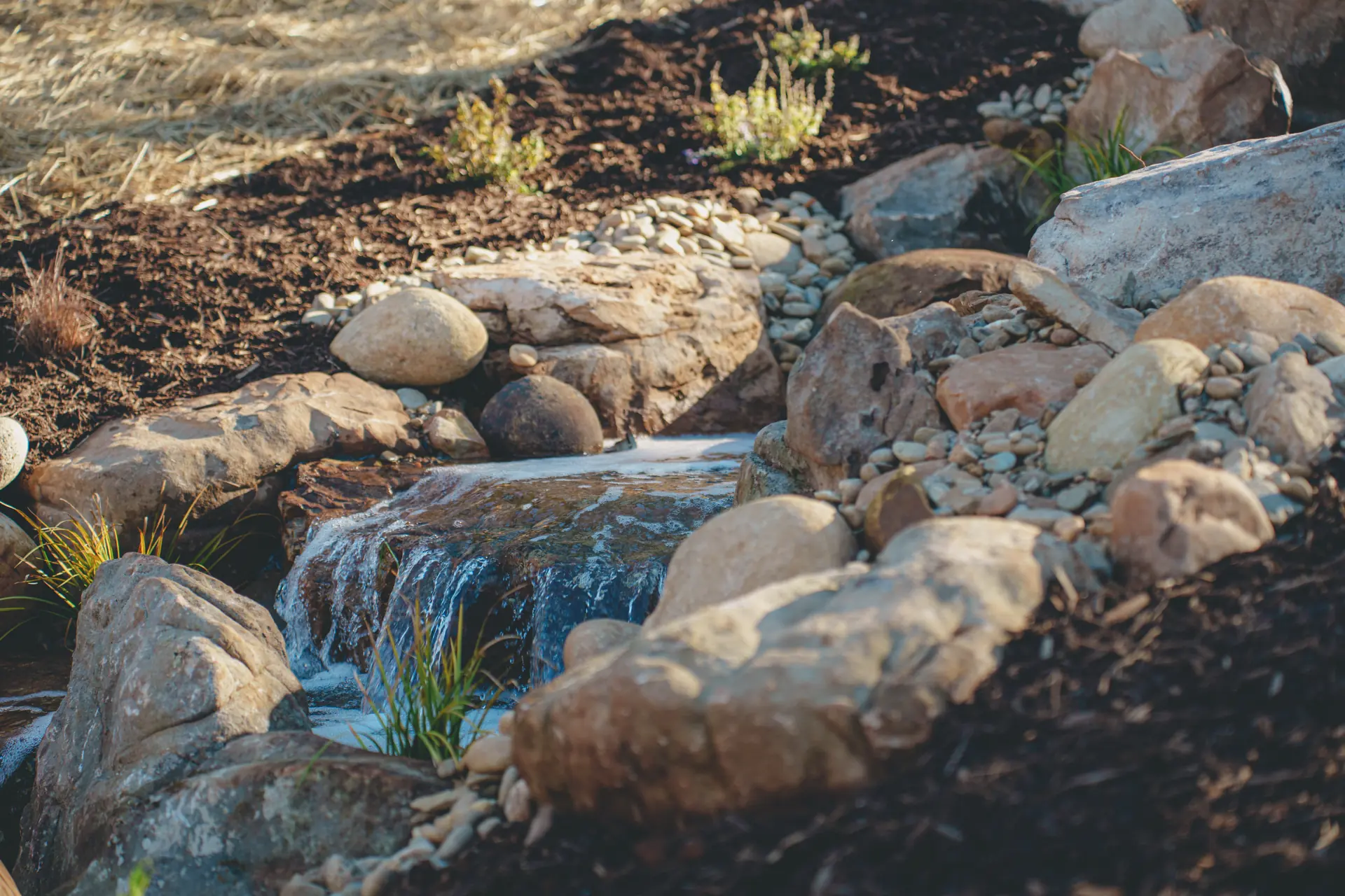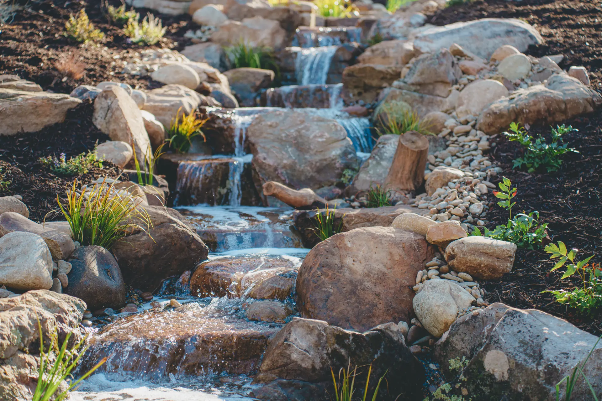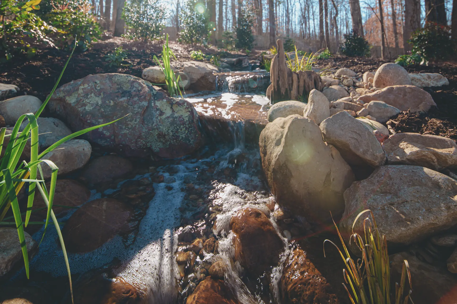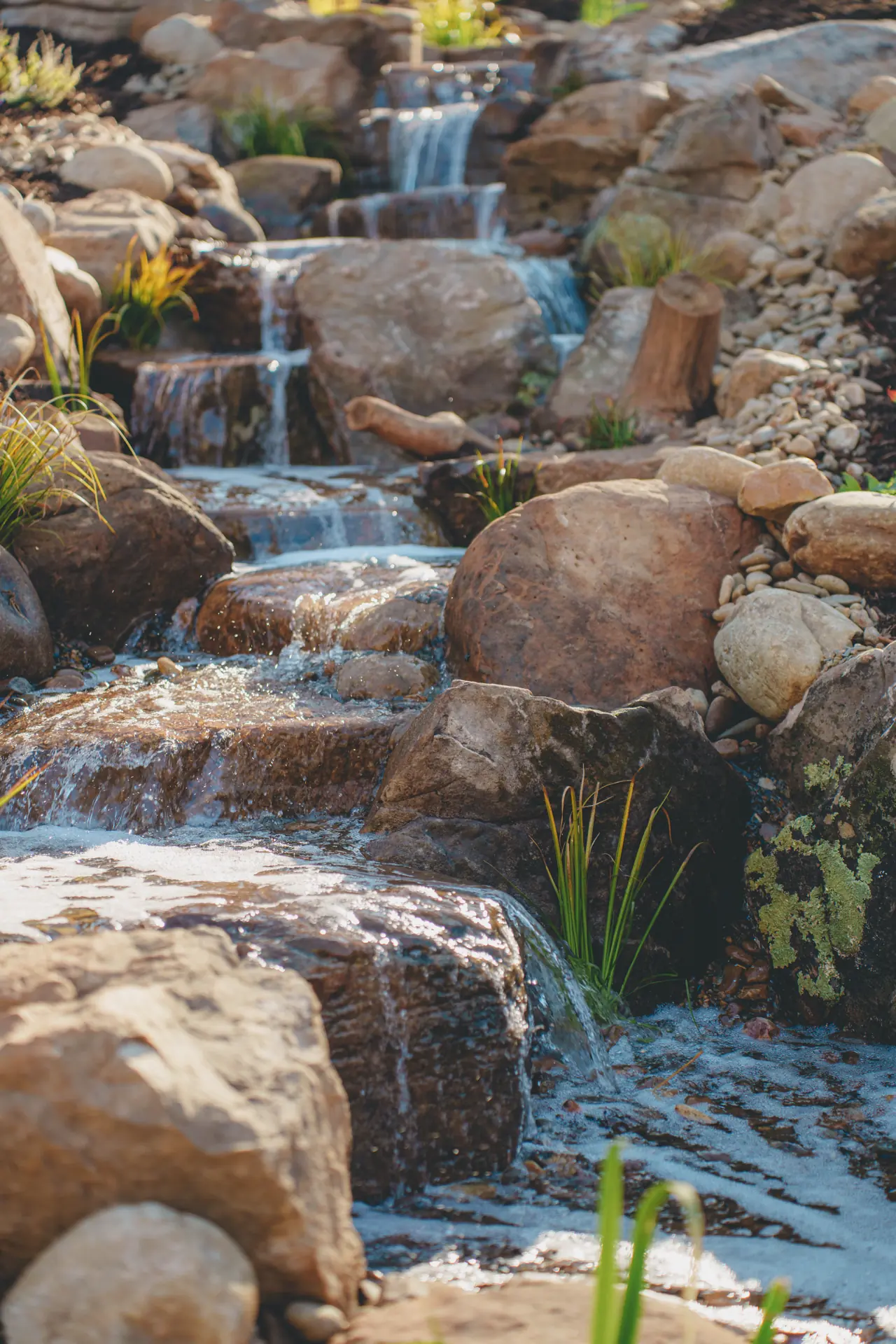 Local fieldstone was used to build the waterfall, giving the project a natural and regional character. Each stone was carefully selected and placed to create a sense of rhythm and movement from top to bottom.