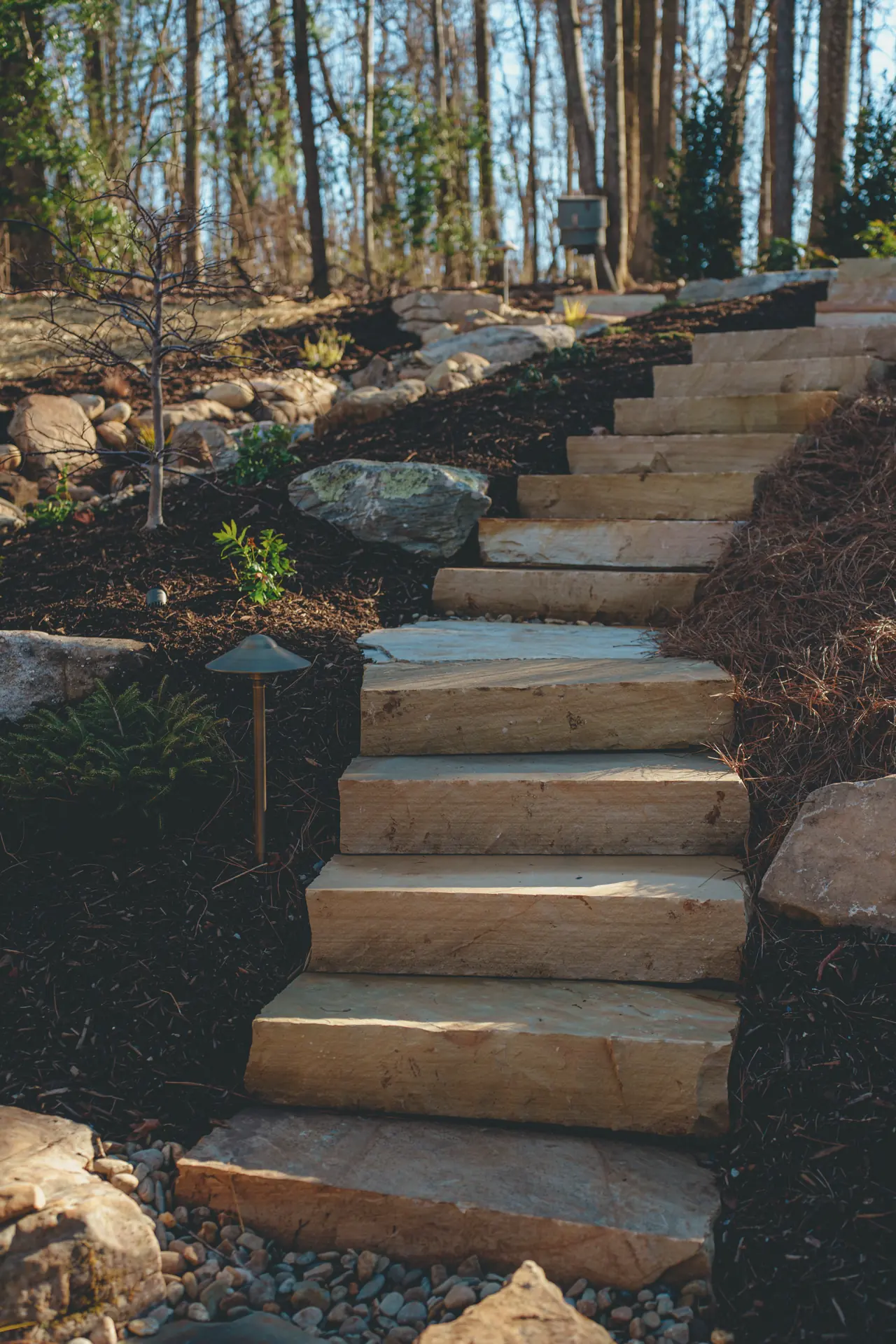 To improve both access and usability, a natural flagstone staircase was built into the hillside, allowing for easy movement up and down the slope. The staircase blends seamlessly into the landscape while working alongside the water feature rather than competing with it.
