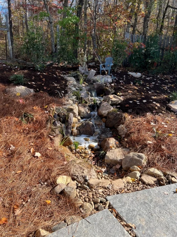 Rather than fighting the natural grade of the yard, the design leaned into it. The slope became the perfect setting for a cascading water feature and layered plantings that feel organic and natural.