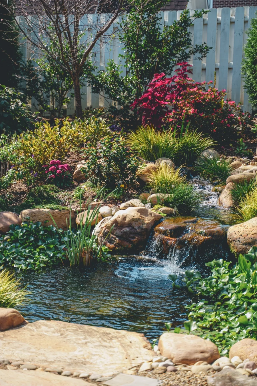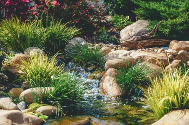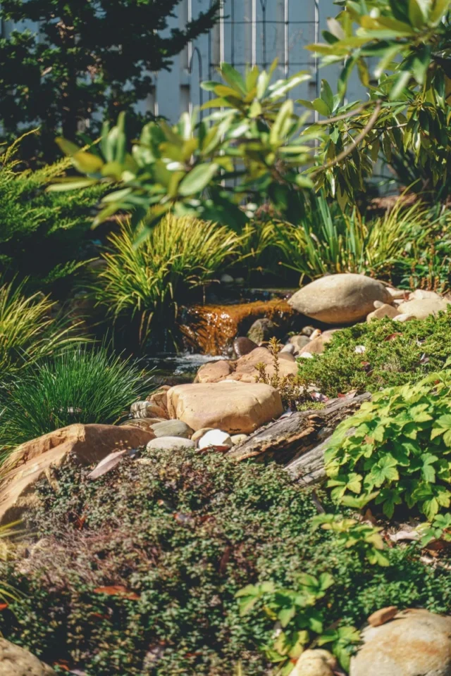 A gentle waterfall or meandering stream soothe the senses, block urban noise, and invite peaceful moments outdoors.