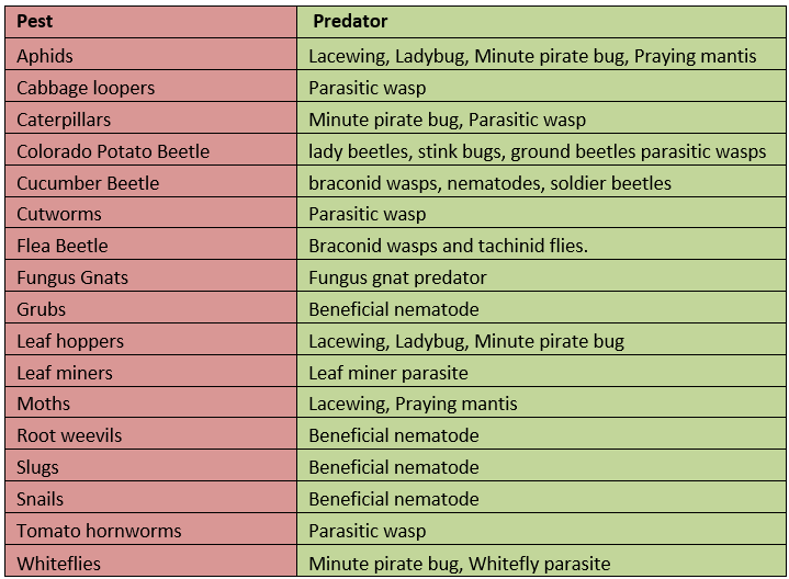 Here at the Garden Center we encourage the use of natural practices to deal with harmful bugs whenever possible. First and foremost we encourage prevention which includes attracting beneficial insects to take on the battle against the bad guys. So who are these evil doers and who are the soldiers that attack them? Below is a list of the most common pests that can decimate a vegetable garden, along with the good bugs that will keep them under control.