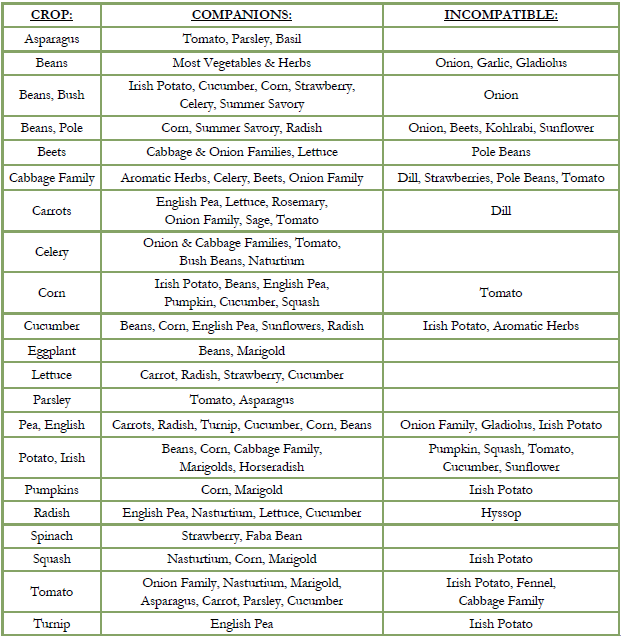 Our friends at UT Extension put together a wonderful chart that shows what plants work together and which plants don’t. Rather than reinvent the wheel we will share this with you below.